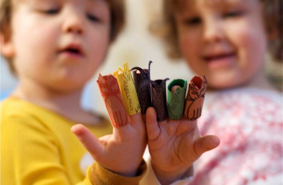 پنج صورتک به بلندی و پهنای انگشــتان دســت از مقوایــی رنگی ببرید. صورت هایی با گردنهای بلند و کشــیده، چهرههای بامزه، داغهای نوکتیز یا کوفتهای و پهن، چانههای برجسته و پیشانیهای عجیب و غریب. زیر گلوی هر یک از صورتکها نوار باریکی به صورت افقی بچســبانید و دو ســر آن را به اندازهی دور انگشتان به هم بچسبانید. شما از این قسمت میتوانید صورتک خود را تکان هم بدهید.روش بازی: دو، سه یا هر پنج صورتک را روی انگشت نشانه، انگشت شست و... بگذارید و دســتهای خود را پشت میز پنهان کنید. سپس روی لبهی میز به وســیلهی آنها نمایش بدهید؛ این عروسکها با هم حرف میزنند، ورجه وورجه میکنند و... پس از چند لحظه نقش خود را به نوه تان بدهید.